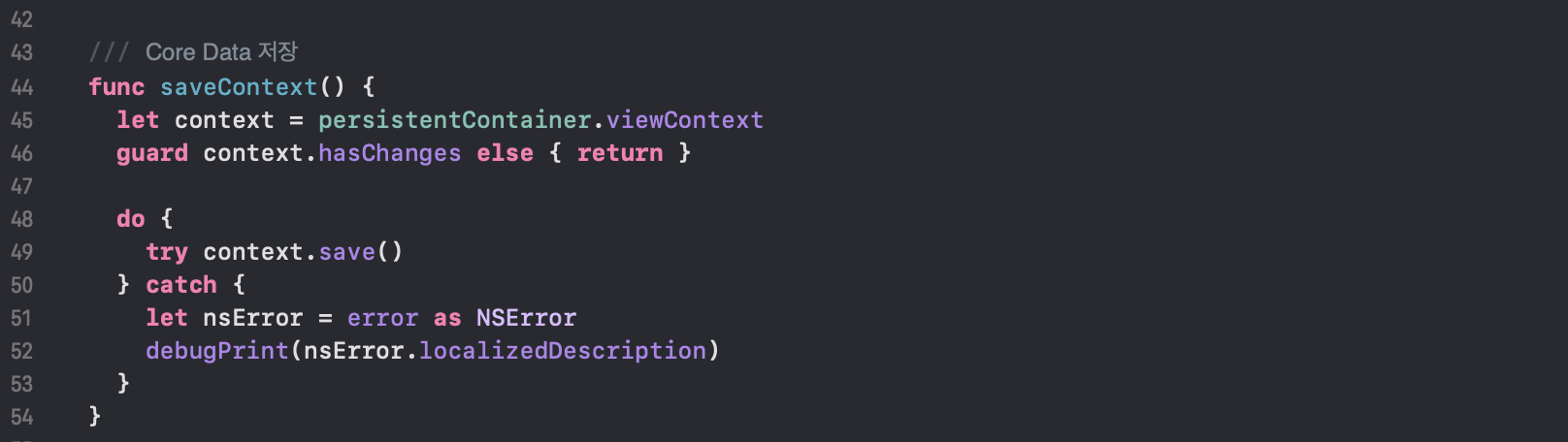 45행) CoreData의 entity 모델을 사용하기 위해 접근하는게 persistentContainer.viewContext입니다. persistentContainer는 NSManagedObjectContext를 반환하는데 NSManagedObjectContext는 관리객체의 변화를 추적하고, 관리하기 위한 객체 공간이라고 합니다.