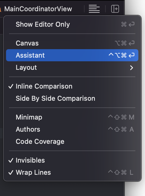 목록 리스트 모양 버튼을 클릭 후 Assistant 옵션을 선택해주세요. 그렇게 되면 이제 하나의 Xcode editor 내에 다수의 창이 보이도록 할 수 있습니다.
