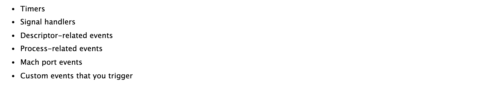 디스패치소스는 특정타입의 시스템이벤트 정보를 캡슐화하고, 특정 블록객체(클로저 등의 객체)나 함수를 이벤트가 발생할 때마다 디스패치큐(DispatchQueue)에 제출합니다. 당신은 다음의 시스템이벤트들을 감시하기위해 디스패치소스를 사용할 수 있습니다.