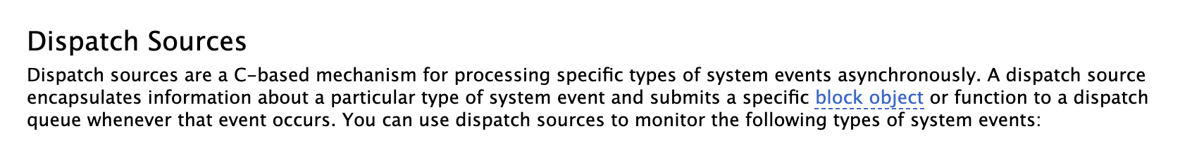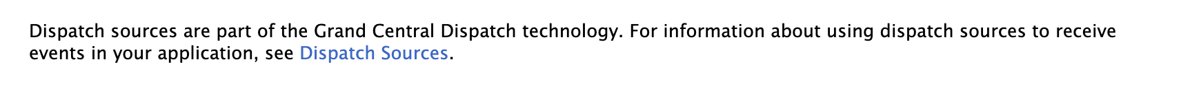 디스패치 소스는 GCD(Grand Central Dispatch) 기술의 일부입니다. 디스패치 소스를 사용하는 것에 대한 더 많은 정보는 Dispatch Sources 문서를 참조하세요.