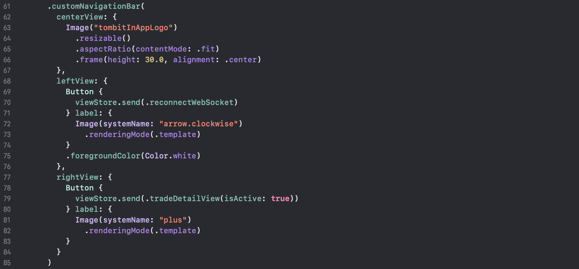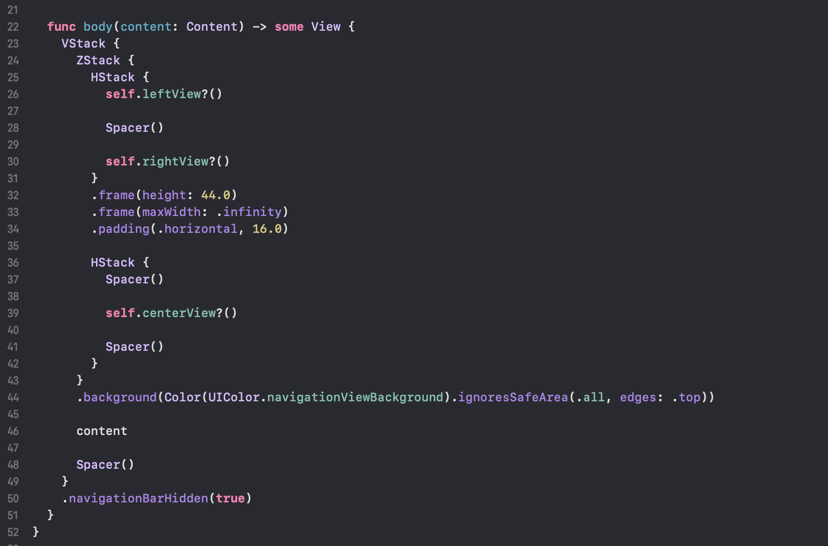 위 코드는 사용중인 View의 블럭 바로 한 줄 밑에 작성됩니다. 중앙에 특정 View를 보여주는 NavigationBar를 적용합니다. 앞서 구현한 View extension method를 사용하고 있습니다