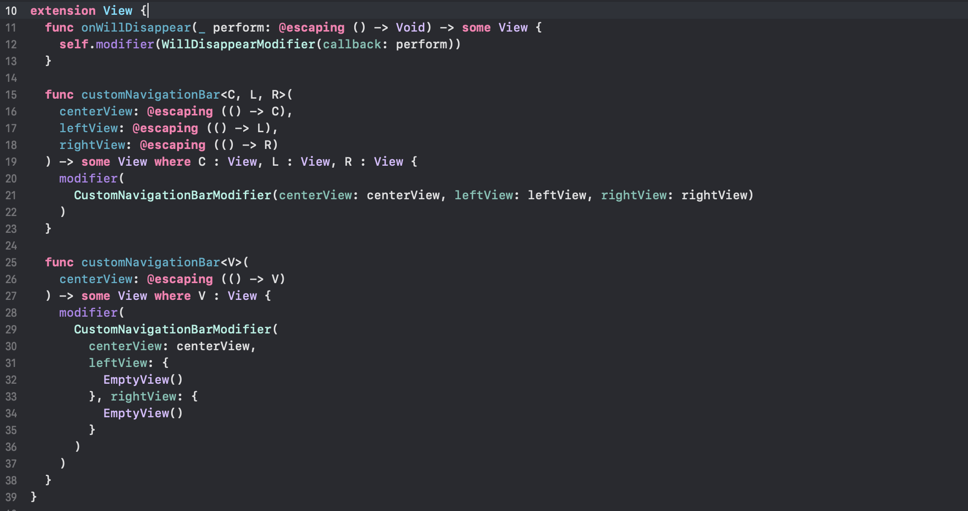 앞서 말했듯이, ViewModifier를 프로토콜로 채택한 구조체를 만든 후 인자로 받을 클로져들을 정의하고 있어요. 각각의 클로져들은 각 위치 별로 고유의 제네릭 타입을 갖고 있는데요. 모두 View 프로토콜을 준수해야 합니다.