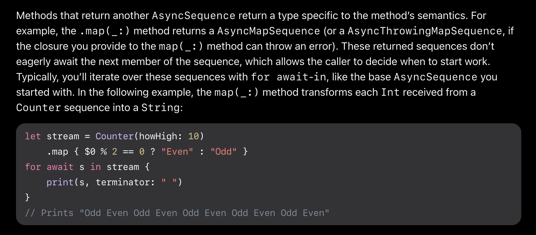 예시로, 위 map 연산자는 각각의 Int 타입 Element -> String타입의 Element를 가진 AsyncSequence 타입으로 반환해주고 있습니다.