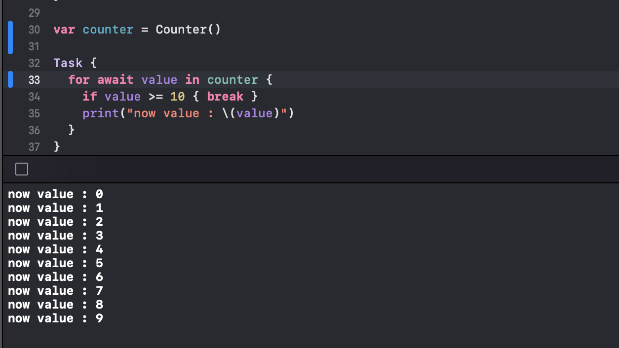 실제로 AsyncSequence를 채택한 counter를 사용해봅시다. 31행에서 생성했구요. Task 블럭내에서 async 동작을 실행하는 모습입니다.