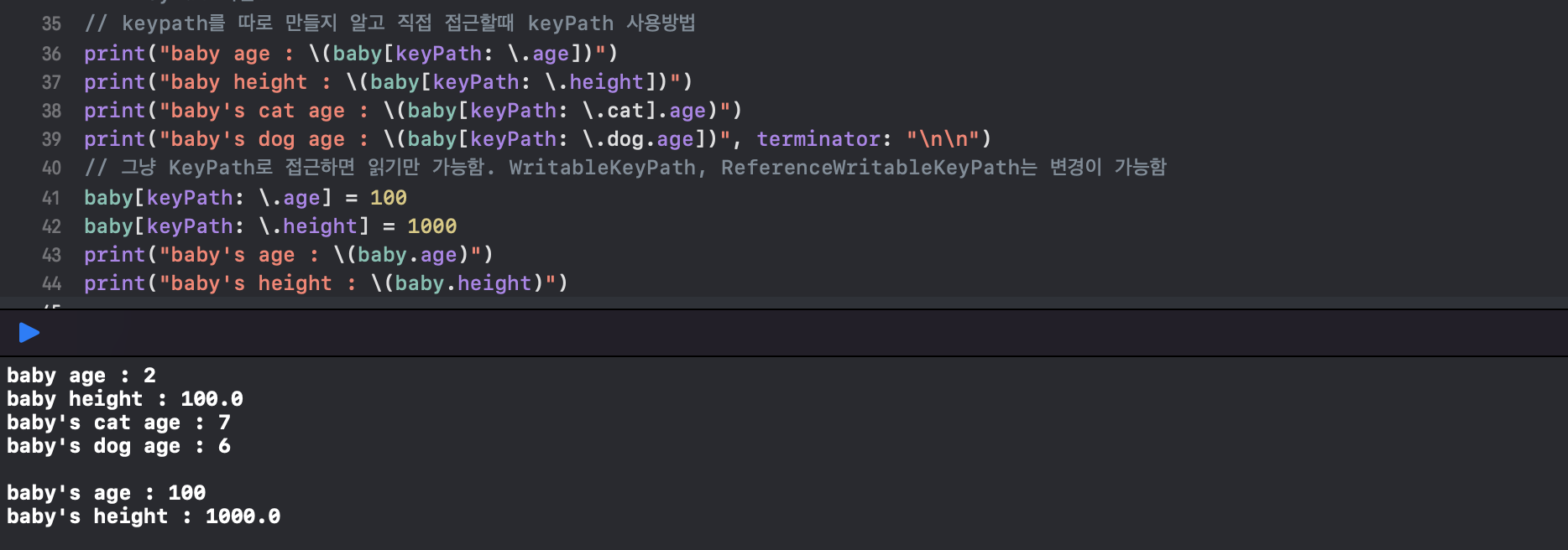 이때 접근한 값이 변수인 경우, 첨자(subscript) 접근을 한 후, 값을 변경할 수도 있습니다. 변경 후에 baby의 age, height를 출력하면 변경된 값이 출력되는 것을 볼 수 있죠. 이렇게 keyPath 사용해서 읽기 쓰기가 가능한데요.
