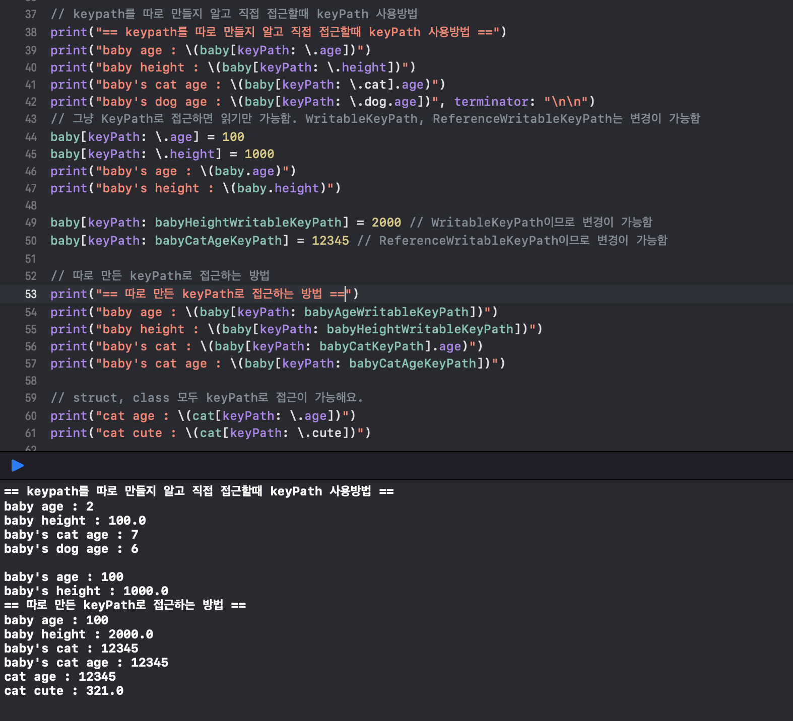 48 ~ 55행) 따로 받아둔 KeyPath, WritableKeyPath를 이용해서 멤버를 접근할 수 도 있었습니다. baby[keyPath: babyCatKeyPath].age 처럼 keyPath로 접근한 멤버의 하위 멤버에 접근할 수도 있어요. Writable이 붙은 KeyPath로 접근한 경우, 읽기 뿐만 아니라 쓰기도 가능한 것을 볼 수 있습니다. 위 코드의 출력 결과는 어떻게 될까요? 아래를 보시면 알 수 있습니다.