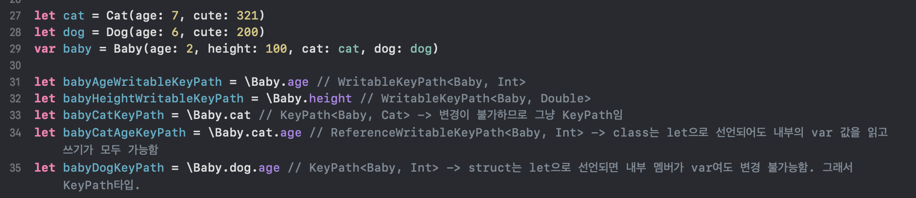 이렇게 위와 같이 KeyPath를 담아보다보면 각각의 타입이 다른 것을 알 수 있습니다. 이때 값 변경이 불가한 멤버에 대한 KeyPath는 "Writable" 키워드가 붙지 않아요. 말 그대로 쓰기가 불가능함을 의미하는 것입니다. 즉, KeyPath<Baby, Int> 타입은 쓰기가 불가능한 멤버에 접근하는타입, WritableKeyPath<Baby, Double>, ReferenceWritableKeyPath<Baby, Int>는 읽기, 쓰기가 모두 가능한 겁니다.