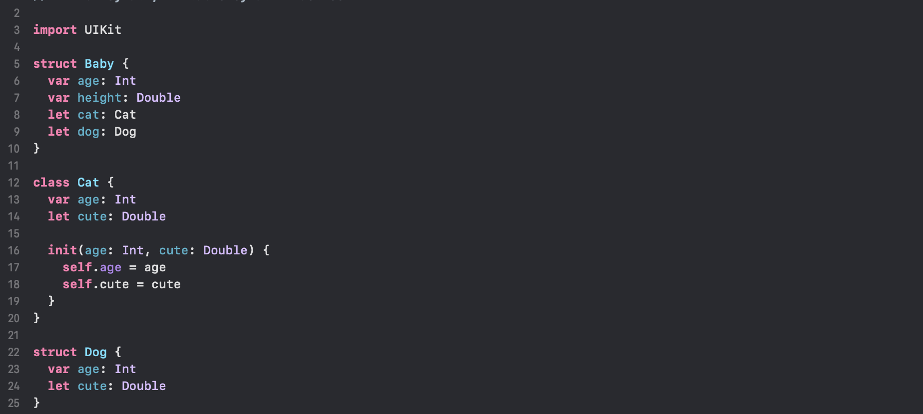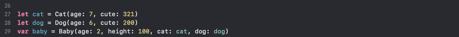 먼저, struct, class 몇개를 구성했습니다. Baby 구조체는 age, height 변수와 cat: Cat, dog: Dog를 갖습니다.