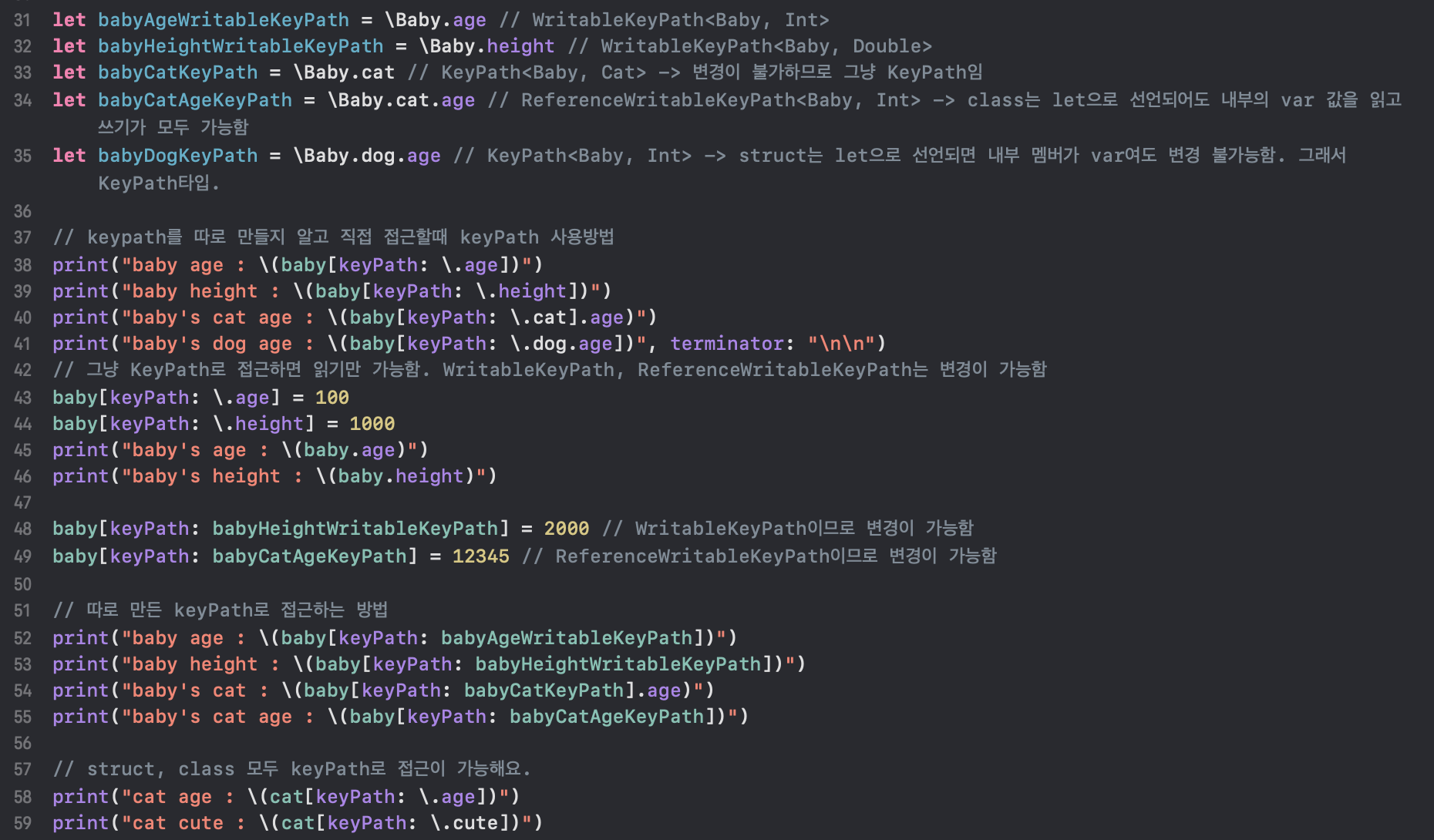 또한 KeyPath 우측에 정의되는 두개의 타입은 차례대로 <{첨자 접근하는 대상 타입}, {실제 읽거나 쓰고자 하는 멤버의 타입}> 이 됩니다. 예를들어, WritableKeyPath<Baby, Int>는 Baby[keyPath:] 로 접근을 하고, Int타입의 멤버를 읽고 쓰는데 사용이 가능한 것입니다. 이제 이렇게 정의한 keyPath들을 사용해보겠습니다.