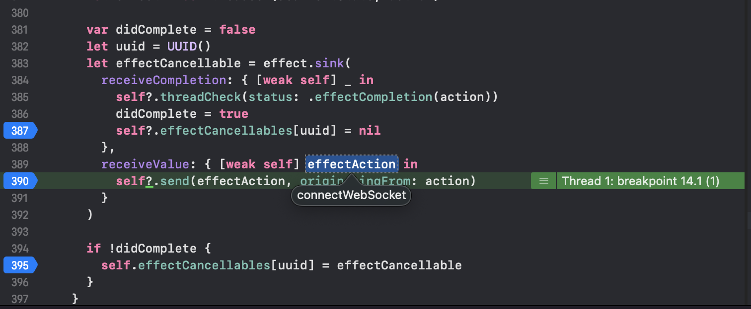 이번에는 originatingFrom에 있는 이벤트가 connectWebSocket이고, 이후 발생한 이벤트, updateWebSocket이 effectAction에 있네요. 이렇게 순환을 돌면서 effectCancellables 딕셔너리에 구독정보를 저장하고, 필요없으면 제거하고 반복하면서 관리되어집니다.