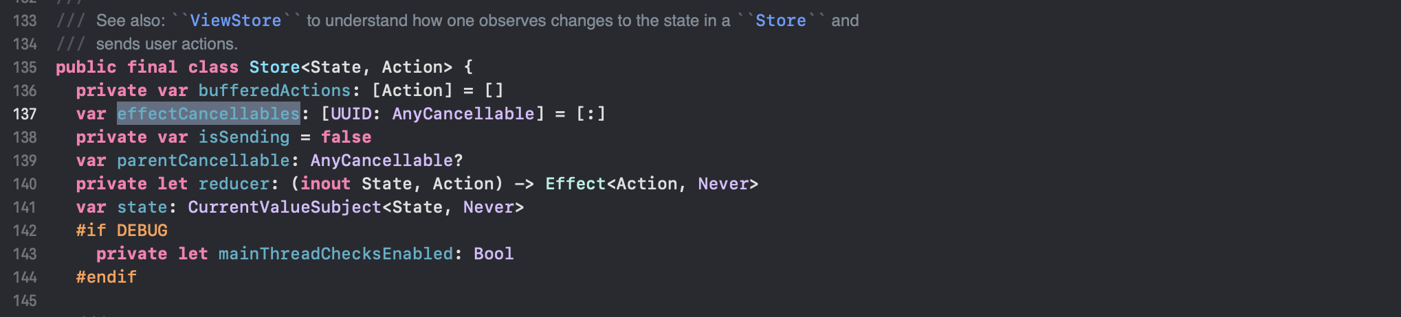 Reducer에서는 이후 이벤트 처리를 위해 Effect를 반환하는데요. 이 Effect는 Combine framework의 Publisher로 되어있습니다. 다양한 Combine Opeartor를 사용할 수도 있는데요. Publisher를 구독하고 메모리 해제하는 코드는 어디에 있는지, 어떤식으로 돌아가고 있을지 보겠습니다.