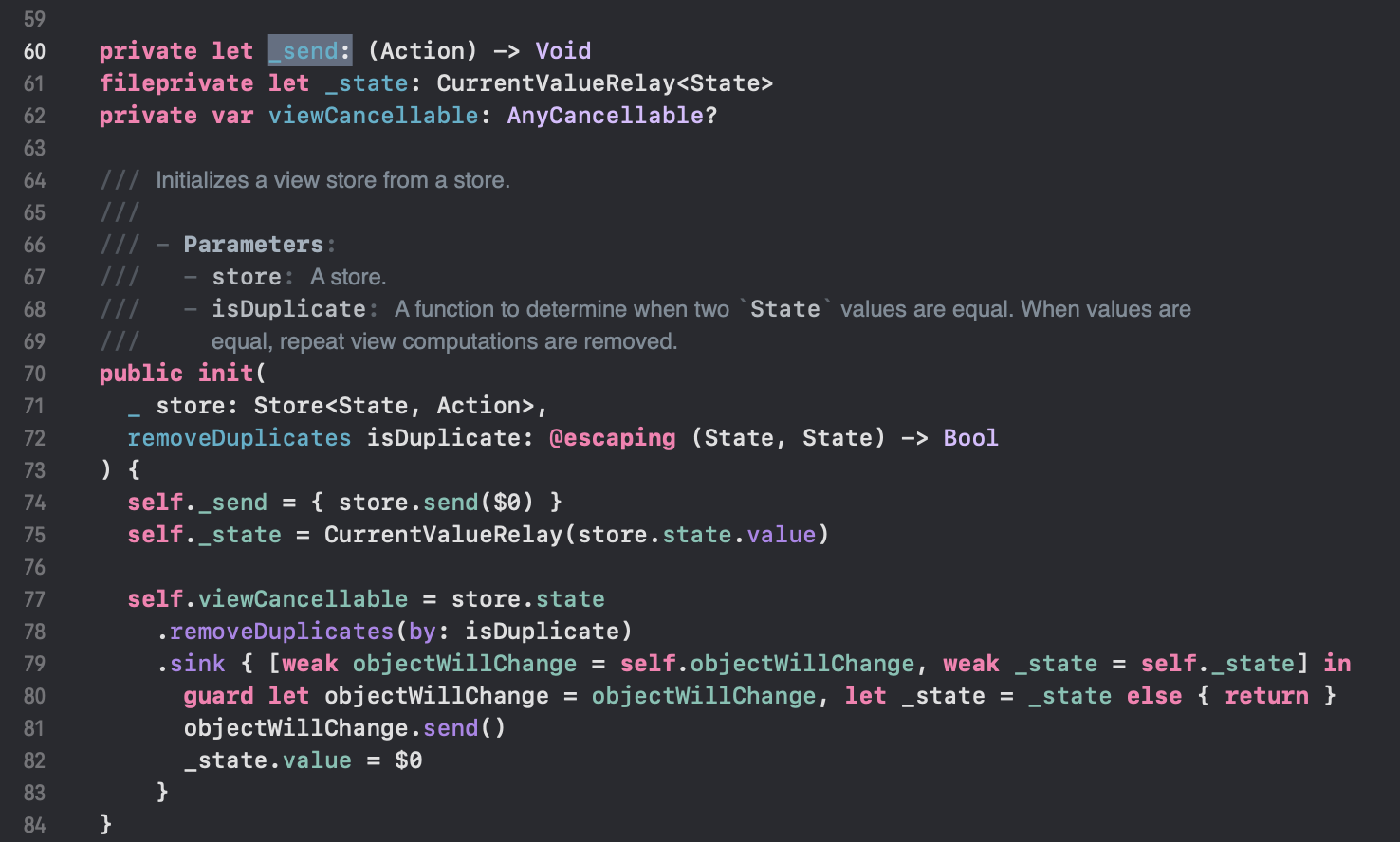 ViewStore의 멤버로 _send 라는 클로져가 있습니다. Action을 받아서 처리하는 클로져 타입으로 되어있는데요. ViewStore의 생성자 구현부를 보시면, 75번째 행에 _send 클로져를 Store의 send 메서드 호출 클로져로 설정하며 참조하고 있습니다.