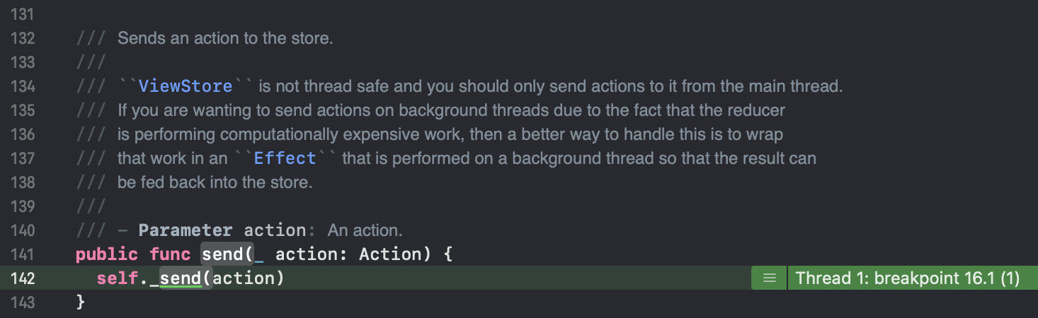 이제 우리가 View에서 이벤트를 처리할때 자주 사용하는 코드입니다. ViewStore의 send 메서드를 보시면, 앞서 Store의 send 클로져를 참조하는 _send 클로져에 action을 넣어서 실행하는 것을 보실 수 있습니다. 이렇게 실행되는 코드는 Store의 send 메서드를 실행하게 됩니다. 이어서 Store의 send 메서드 쪽을 가보겠습니다.