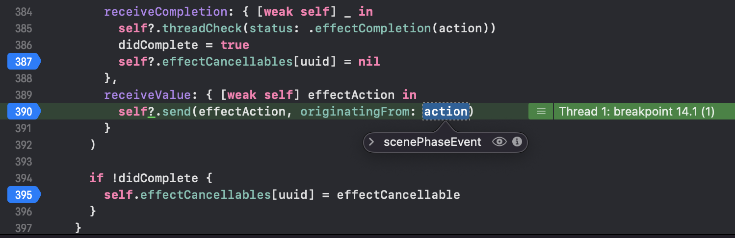 이벤트가 발생하면, effectAction이라는 이름으로 send 된 Action이 들어옵니다. 그리고 originatingFrom에서는 그 이전 이벤트였던 scenePhaseEvent가 나오네요.
