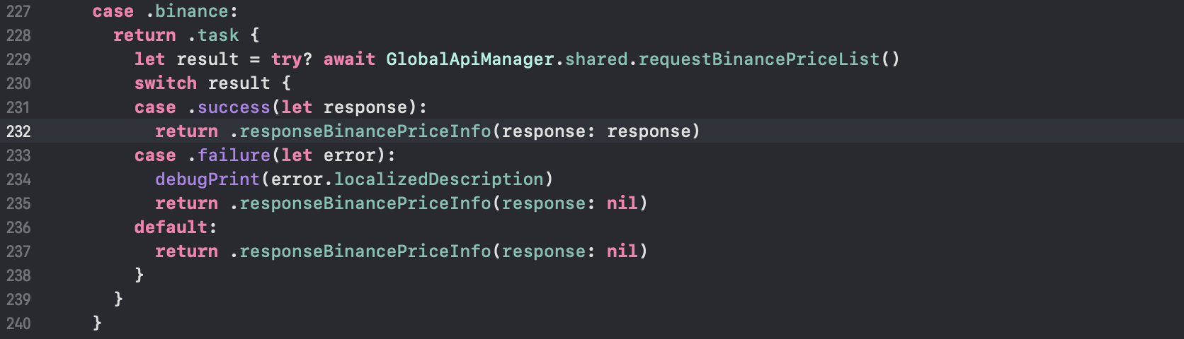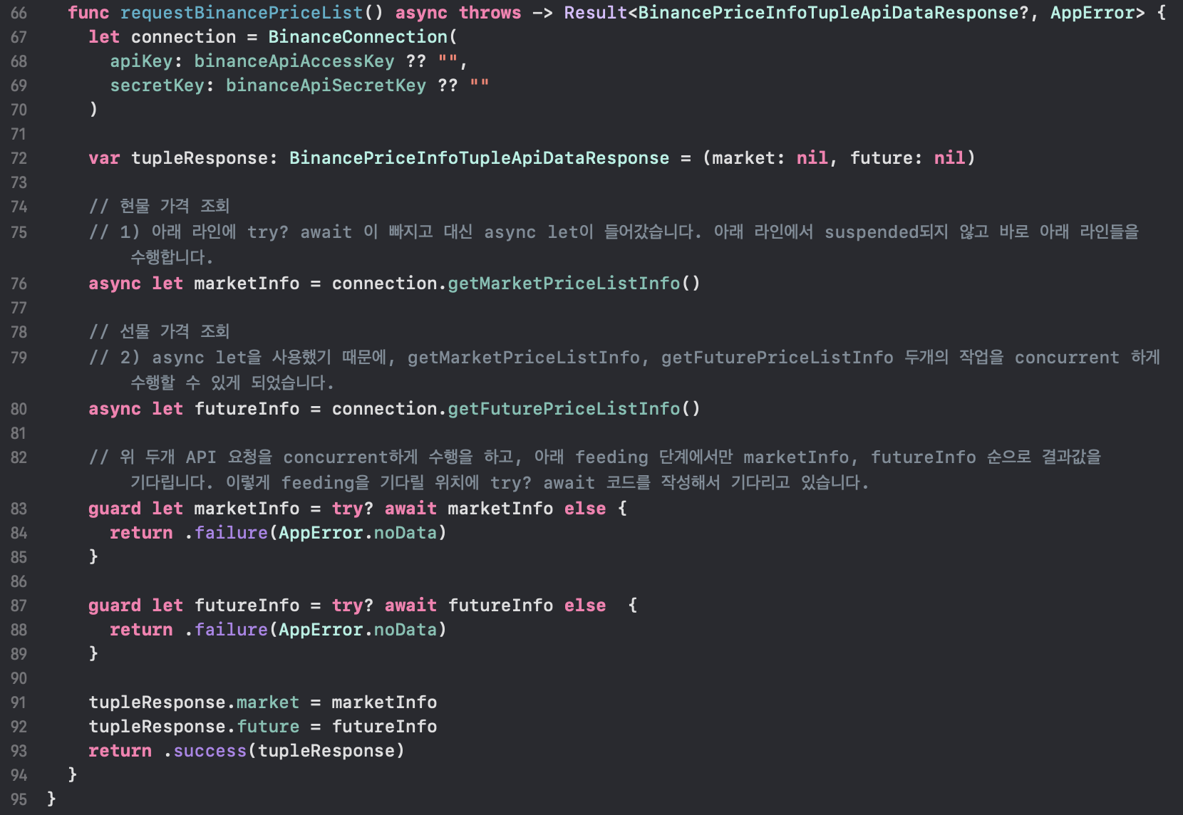 위 코드를 보시면, getMarketPriceListInfo, getFuturePriceListInfo 두개의 async API method를 요청하고 있는데요. 요청할때마다 try? await을 사용하고 있습니다.