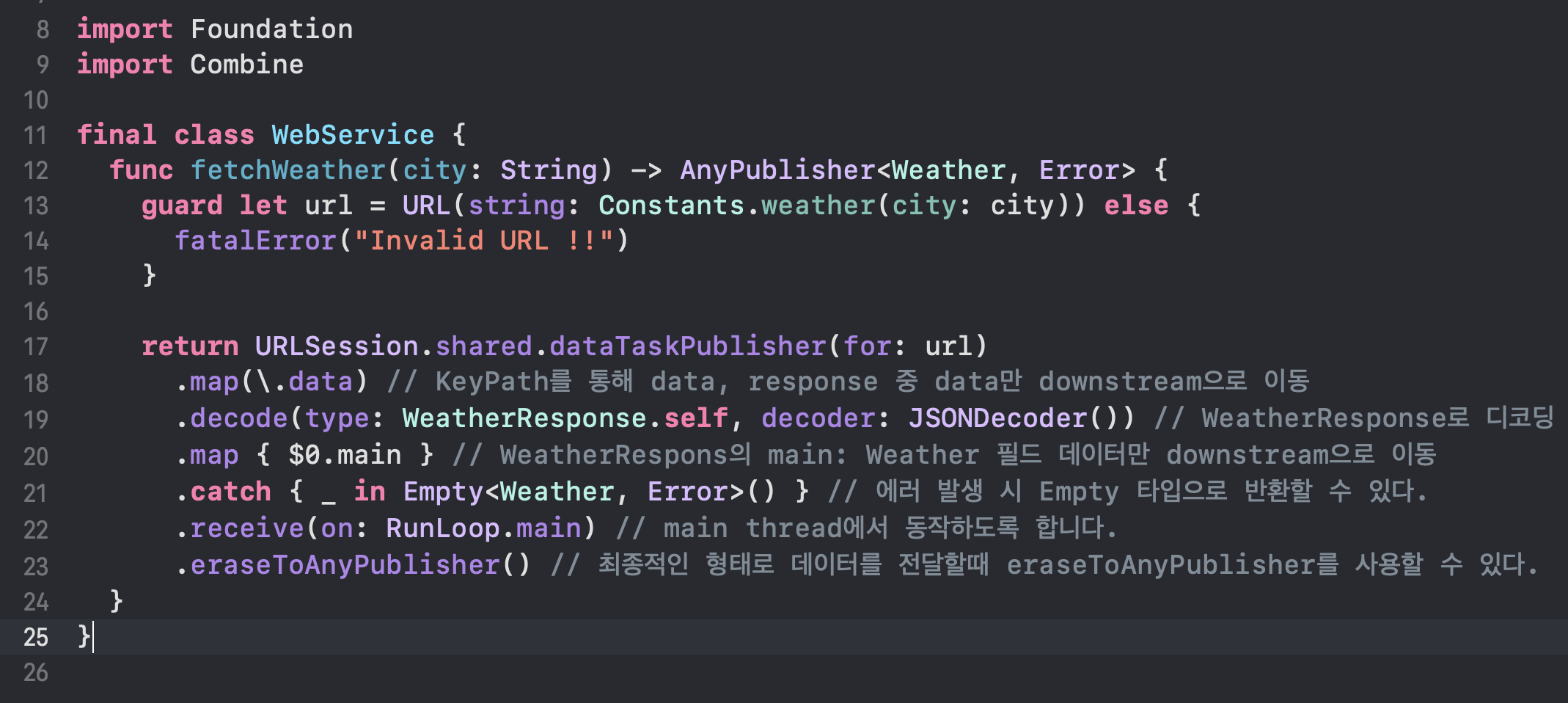 또한, fetchWeather의 중간 연산과정이 이후에 변경되더라도 Output, Failure 타입만 유지만다면, 외부에서는 추상화된 AnyPublisher 타입을 사용하기 때문에 해당 메서드를 사용한 외부 코드의 영향을 줄일 수 있습니다.