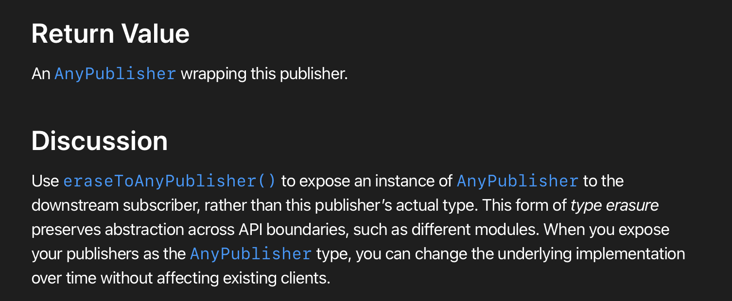 eraseToAnyPublisher는 downstream subscriber에게 publisher의 상세 타입보다는 타입을 지운 상태의 AnyPublisher 인스턴스를 방출하고 싶을때 사용할 수 있습니다. 이렇게 타입을 지운 뒤 반환하는 형태는 다른 모듈과 같은 API 경계 간의 추상화를 유지할 수 있습니다.
