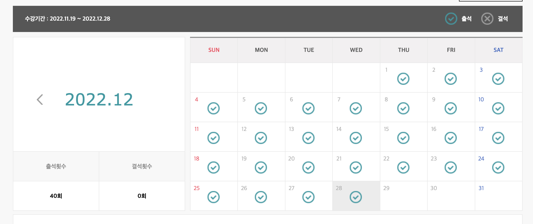저는 직장인 신분이었기에 주중에는 저녁에만 시간이 되었습니다. 이때문에 회식이나 기타 변수로 인해 매일 진행해야하는 출석체크를 놓칠 우려가 있었습니다. 따라서, 퇴근 후, 적당히 휴식을 취한 뒤, 자정이 지난 후 1강을 수강하여 출석체크를 하는 방식으로 공부를 진행했습니다. 여유시간이 있는 주말에는 좀더 시간 비중을 두고 공부를 할 수 있었습니다.