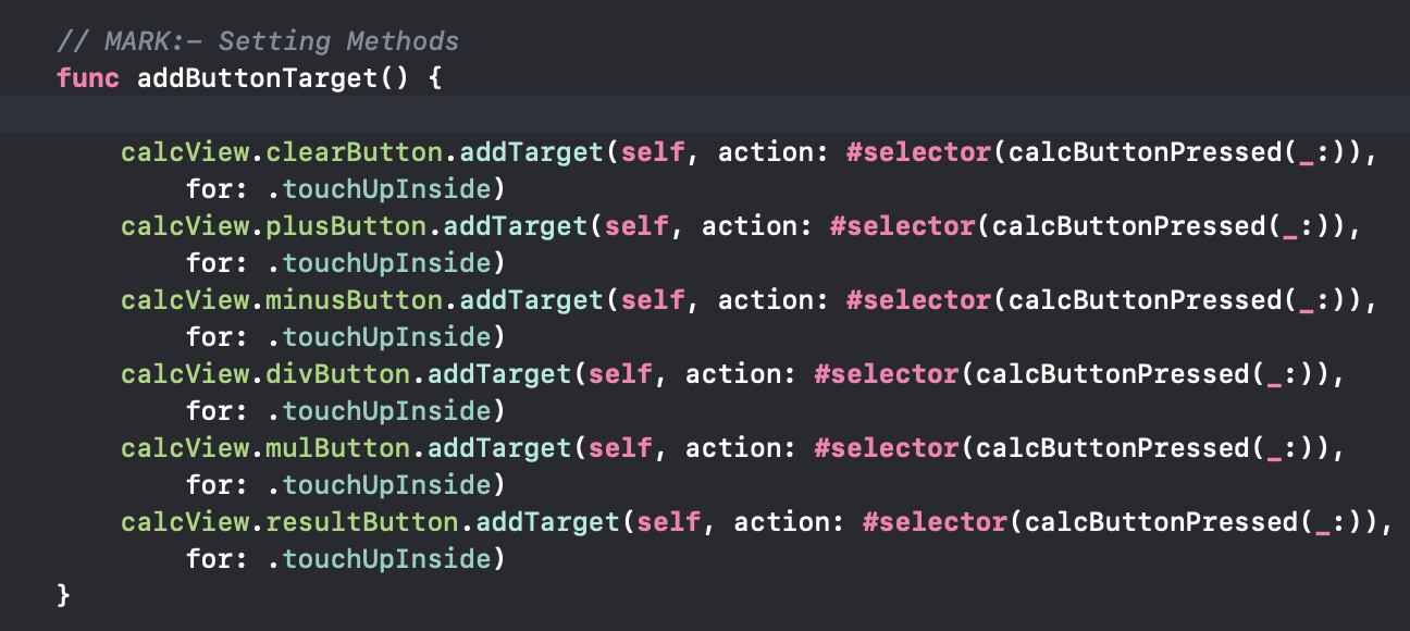 각각의 버튼 타겟을 추가하는 메서드인데요. 모든 버튼은 터치 시 전부 통일한 이벤트메서드를 호출하는데 위와같이 하드코딩 같이 구현을 해놨더라구요. 이것 좀더 깔끔하게 만들 수 있지 않겠냐는 좋은 지적이었습니다.