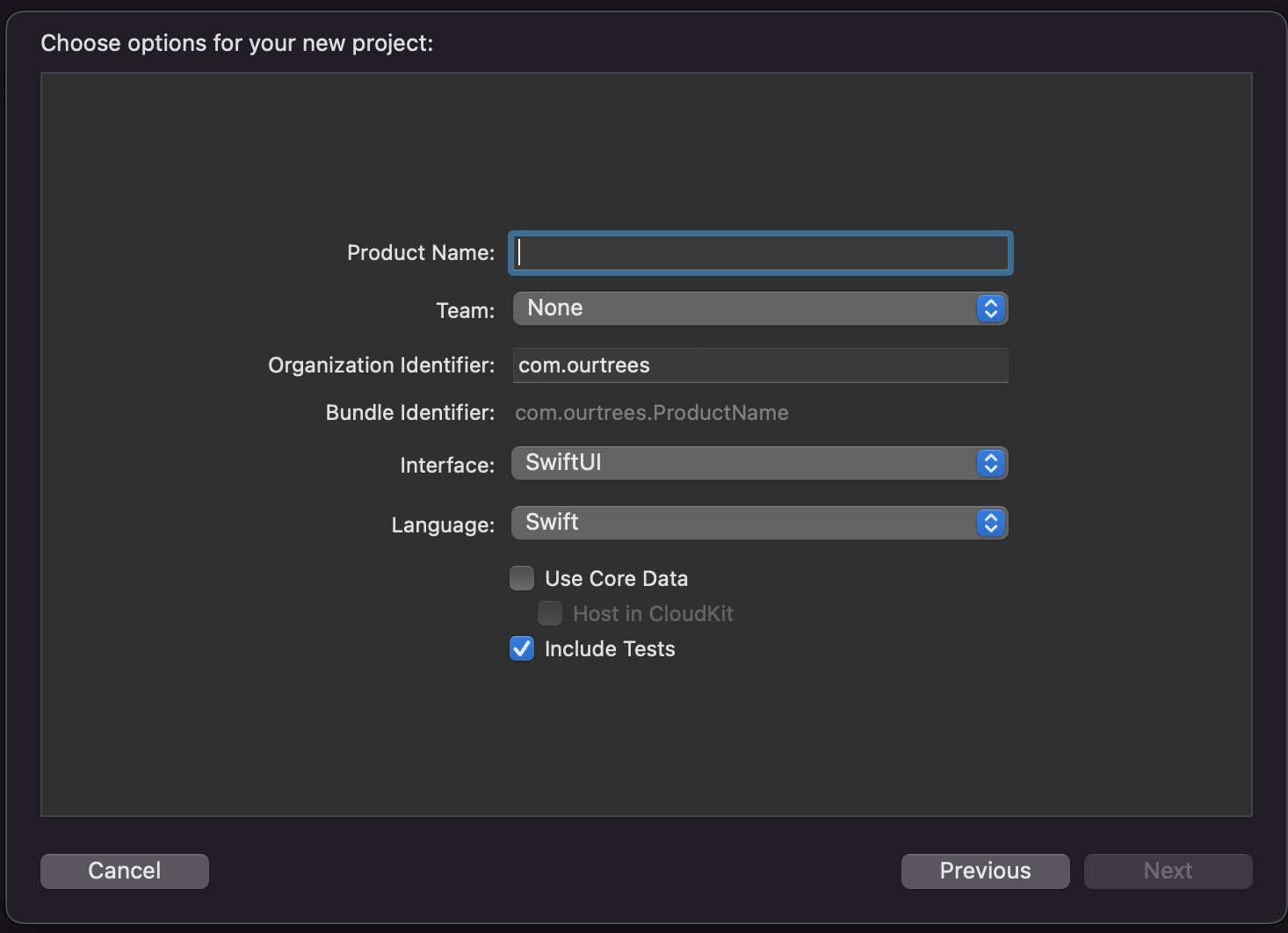 Xcode 실행 -> Command + Shift + N 을 하면 프로젝트 생성 페이지가 나옵니다. 이후 프로젝트 이름을 설정하는 페이지 하단에 Include Tests 혹은 Tests 추가와 관련된 옵션을 체크한 뒤 프로젝트를 생성하면 됩니다.