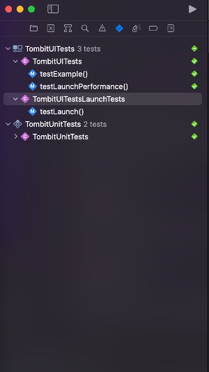 기본적으로 생성되어있는 Tests 객체는 기본적으로 다양한 테스트 코드 작성 관련 기능을 제공하는 XCTestCase class를 상속받고 있습니다. 해당 객체 좌측의 다이아몬드 모양 버튼을 선택하면, 해당 객체에 정의된 모든 Test method를 일괄 실행 시킬 수 있습니다.
