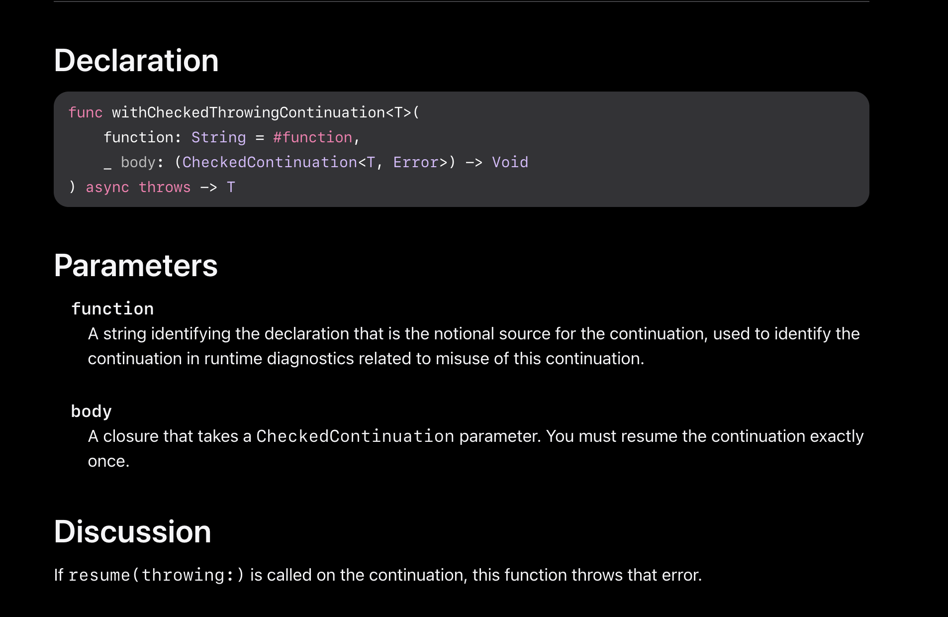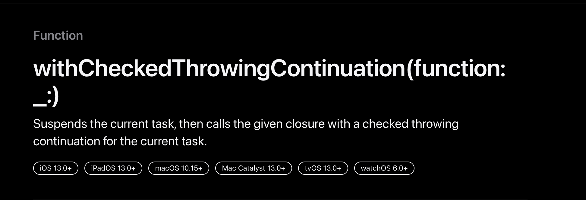 꽤나 긴 이름을 갖고 있는 이 기능들에 대해서 보겠습니다. 먼저, 해당 기능은 여타 async await 기능들 처럼 iOS13+에서 사용이 가능합니다. 현재의 작업을 일시중단하고, 현재 작업에 대한 closure를 호출한다고 합니다. 이때 closure에서는 특정 값을 반환하거나, error를 던질 수도 있습니다.