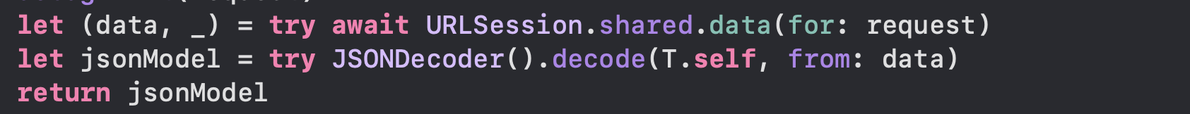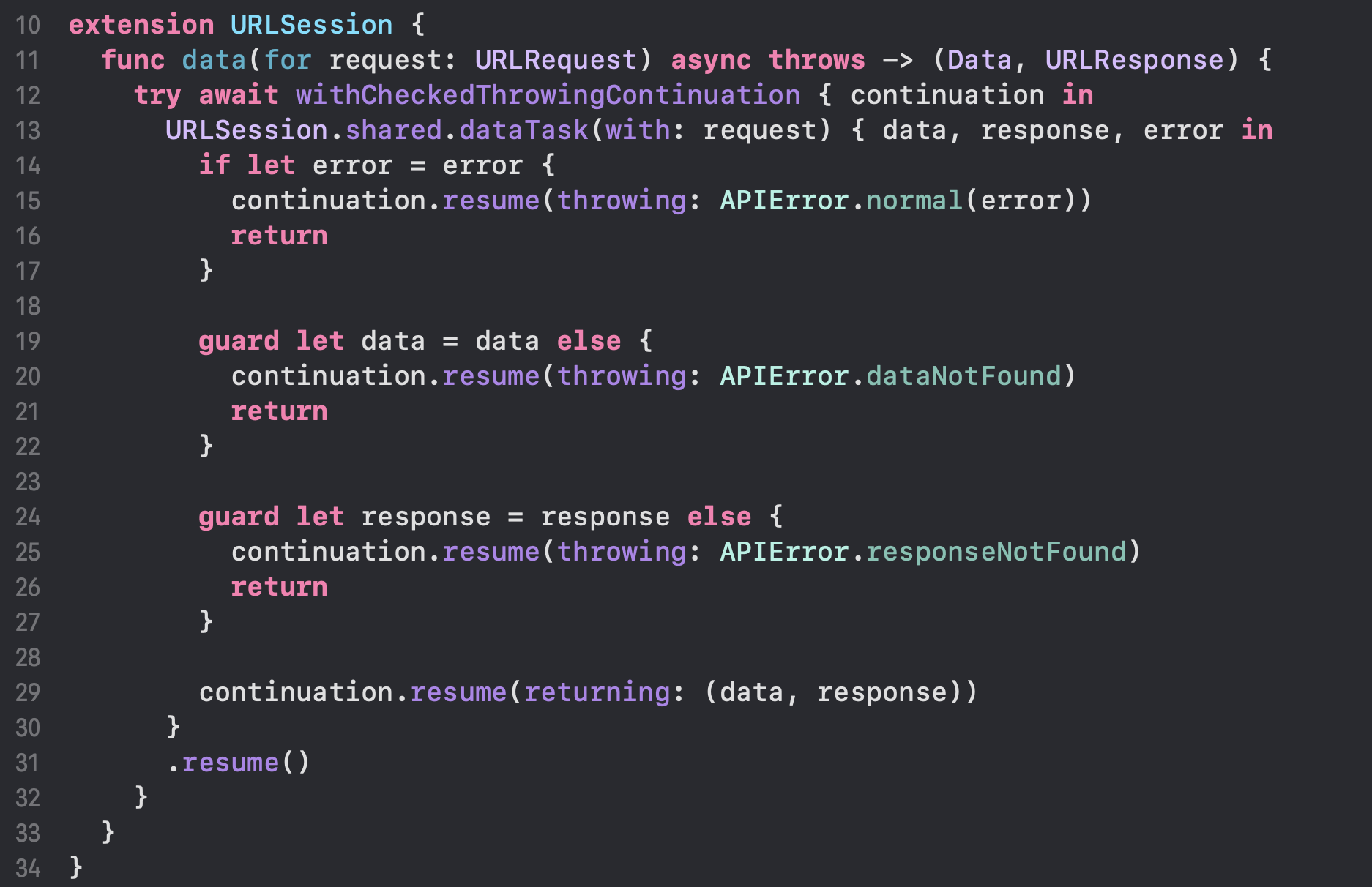 가령, URLSession을 통해 dataTask 메서드를 사용할 수 있는데요. iOS15+ 에서만 async throws method를 기본 제공하고 있습니다. withCheckedThrowingContinuation을 활용하면 iOS13+ 에서도 iOS15+에서만 제공하는 메서드와 유사한 메서드를 구현 할 수 있습니다.