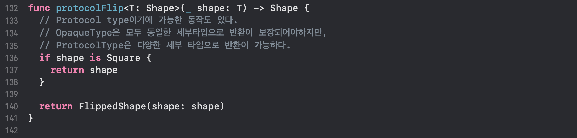 위 메서드를 보시면 메서드 내에서 Shape타입을 채택한 다양한 타입(Square, FlippedShape)을 반환할 수 있는 상황입니다. 이런 경우, 일반 Protocol Type인 Shape를 사용하면 컴파일 에러없이 코드가 동작됩니다.