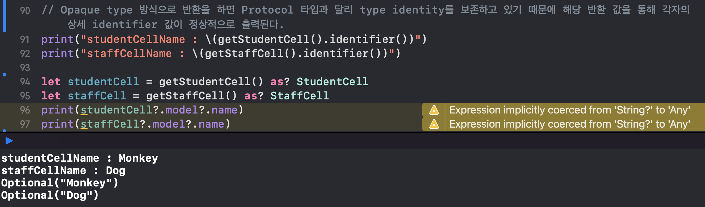 Opaque type으로 반환타입을 바꿔보았습니다. 아까전처럼 각각의 메서드는 분명히 ConfigurableCell을 채택한 StudentCell, StaffCell을 반환하고 있지만, 컴파일 에러 없이 반환이 될 수 있는 것을 볼 수 있습니다.
