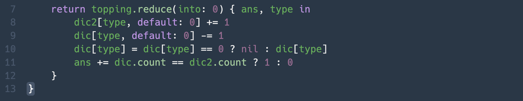 * 여기에서 유의할 점은 dic dictionary의 element 카운팅을 감소시켰을때, 0이 되면 nil을 할당시켜주어야 합니다. 해당 element의 빈도수가 0이 되어있음에도 카운팅이 되어 잘못된 결과를 얻을 수 있기 때문입니다.