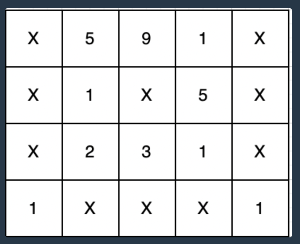 각 행이 하나의 String으로, N개의 String이 답긴 [String] 배열이 입력으로 들어왔을때, X의 방해를 받지 않고 이동 가능한 인접한 숫자들의 합을 오름차순으로 출력하는 문제입니다. 인접합이 0을 초과하는 경우가 없다면, [-1]을 반환합니다.