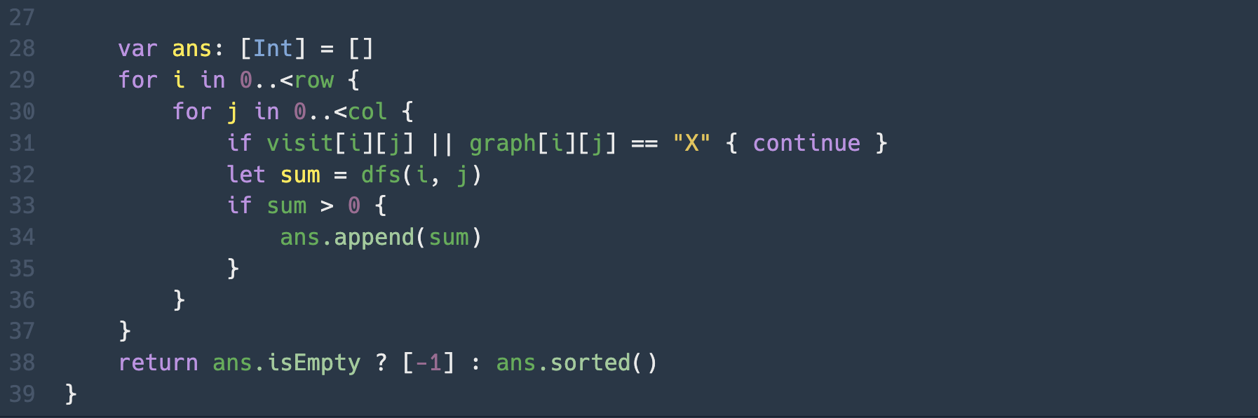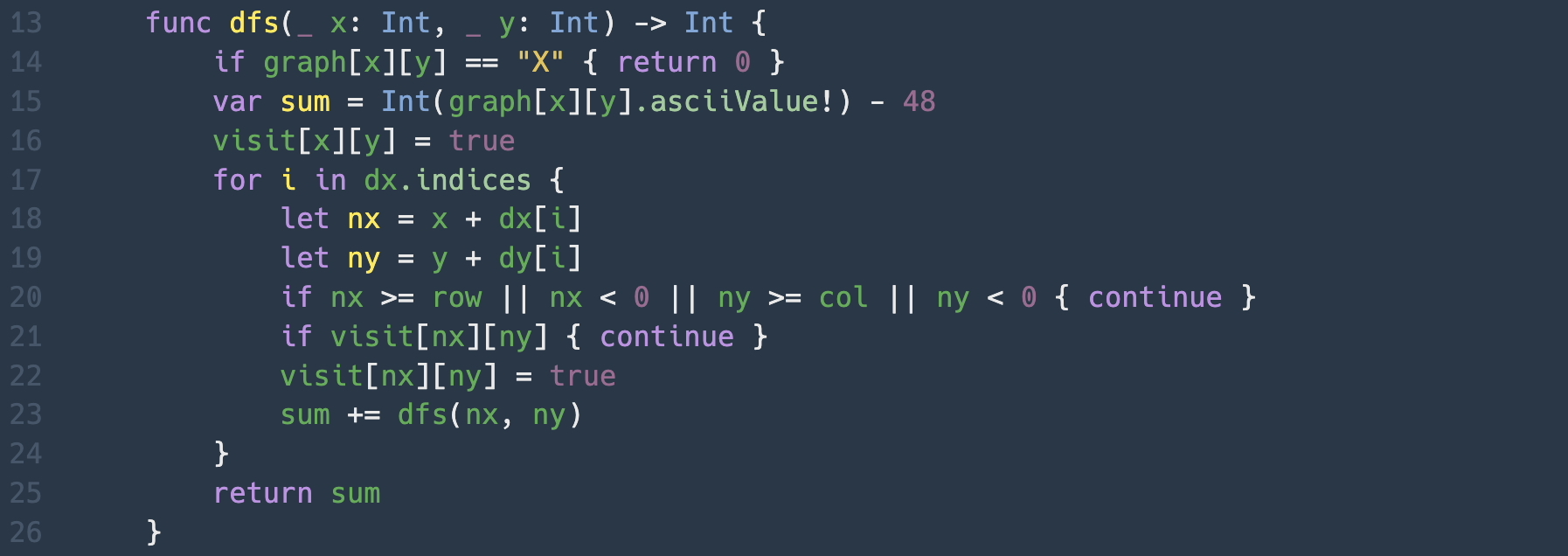프로그래머스 2단계 문제, 무인도 여행 DFS swift 풀이