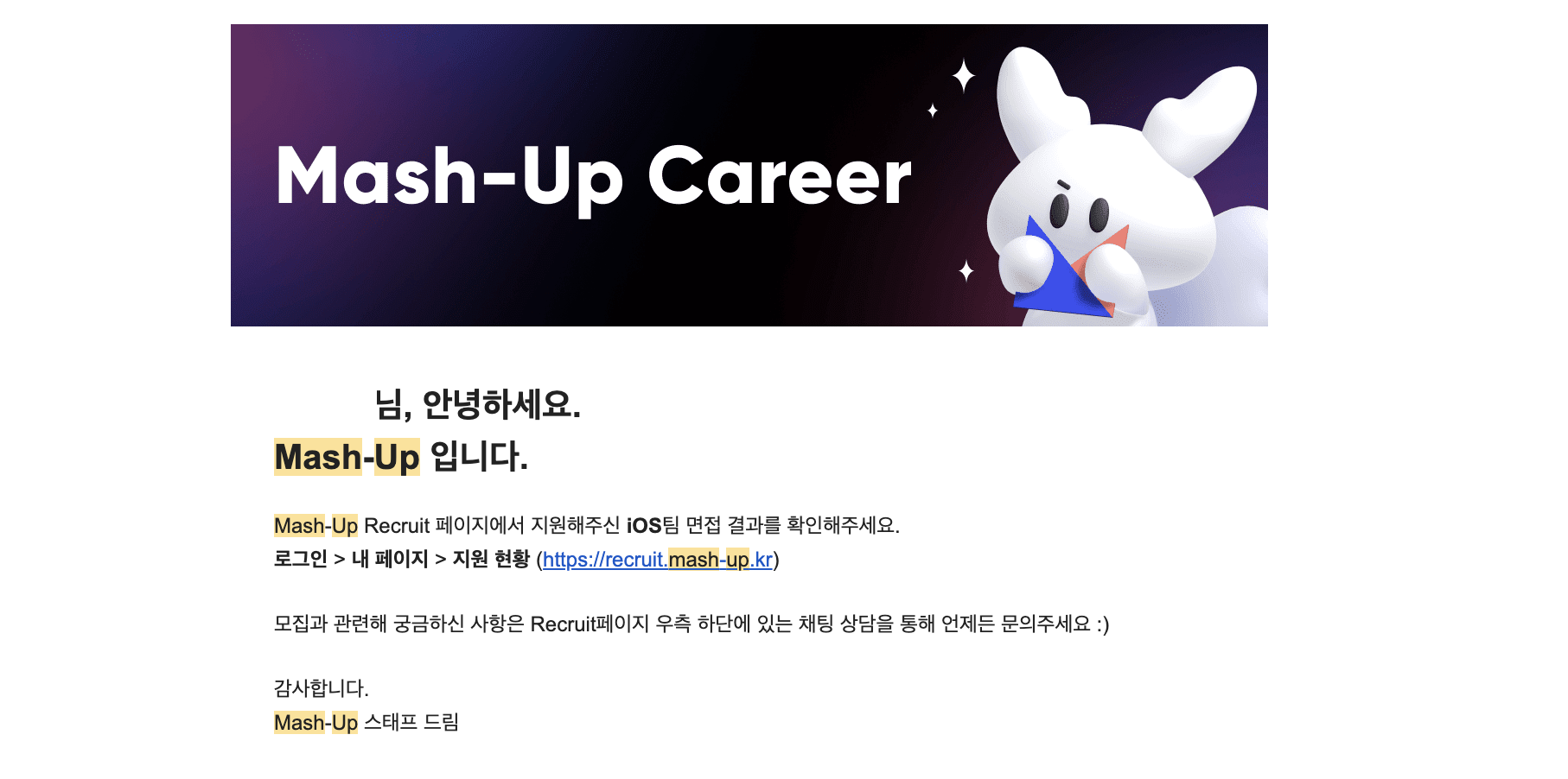 마지막으로 이번에도 높은 경쟁률이 형성되었을텐데 면접의 기회까지 주신 메쉬업 iOS 파트 팀장님께 감사드리고, 즐거운 13기 활동 되시길 바라겠습니다. 😢