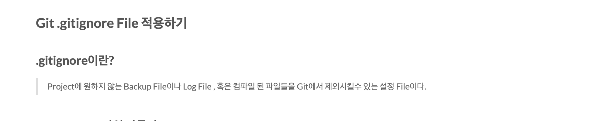 Git .gitignore 파일의 정의인데요. .gitignore는 Project에 원하지 않는 Backup File이나 Log Fille, 혹은 컴파일 된 파일들을 Git에서 제외시킬 수 있는 설정 File이다. 라고 나와있습니다. 이런 .gitignore적용등의 관리는 매우 중요하다고 생각합니다.