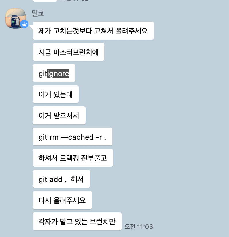 .gitignore가 들어가있는 다시 프로젝트 경로로 들어가서 git rm --cached -r . 를 설정해줘야 하는데요.