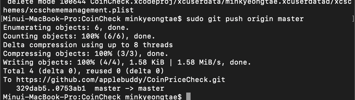 마지막으로 커밋한 내용을 마스터 브랜치로 push 해줍니다.