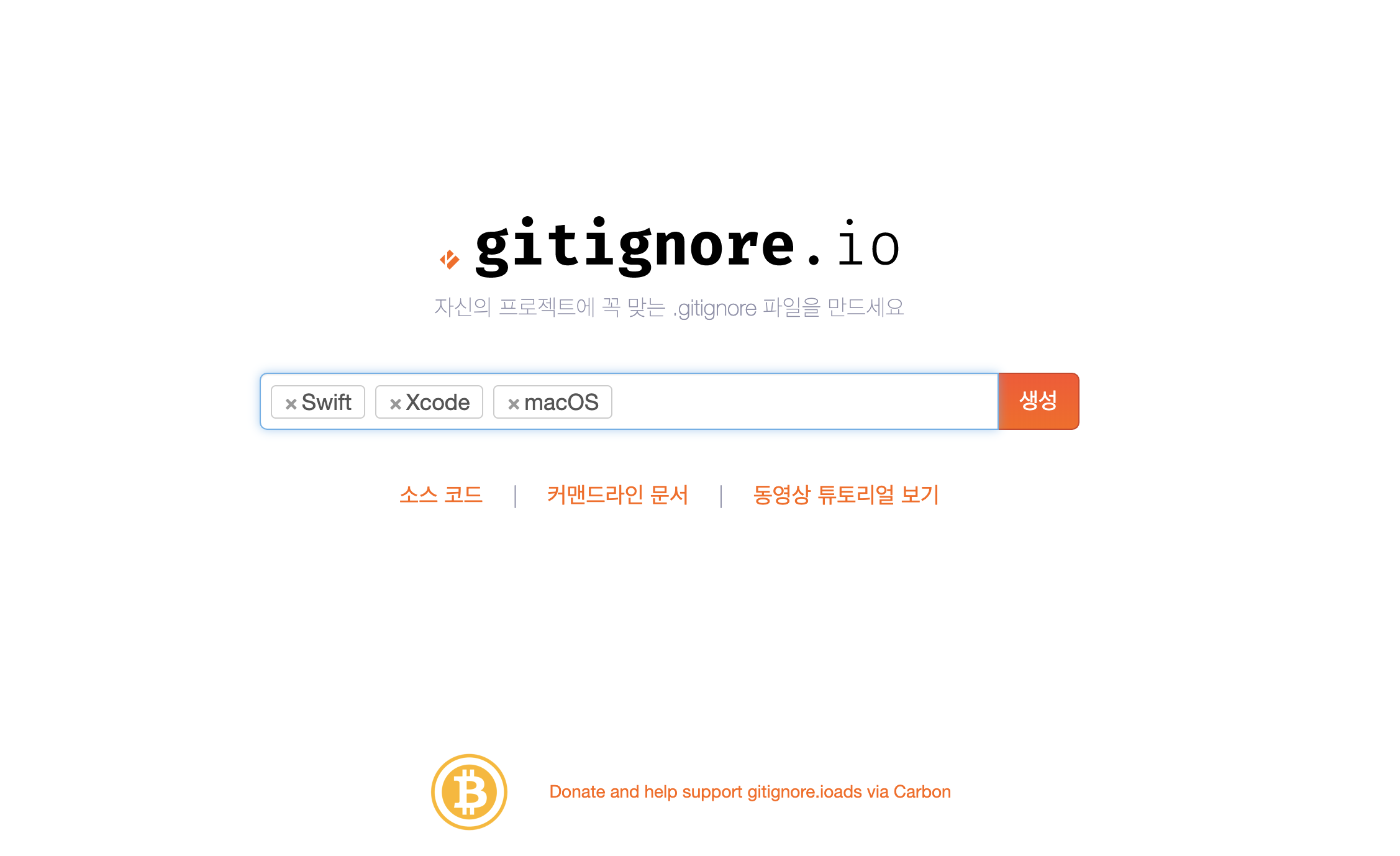 gitignore.io 홈페이지에 들어가서 프로젝트 성격에 맞게 .gitignore 파일 설정을 만들어줍니다. 제가 현재 하는 프로젝트의 성격에 맞게 Swift, Xcode, macOS를 넣어줬습니다. "생성" 누르시면 자신의 프로젝트에 맞는 .gitignore 내용을 만들어줍니다.