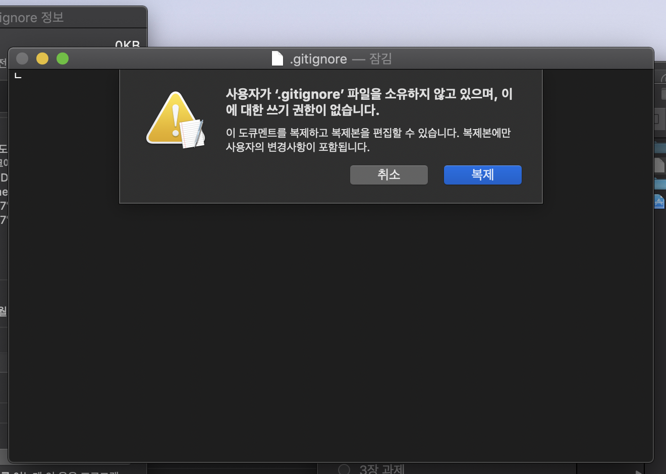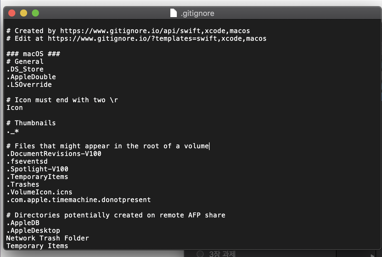 위와 같이 .gitignore에 넣은 소스코드를 만들어줍니다. 복사해서 .gitignore에 넣어주시면 되는데요. macOS 사용자에 따라 .gitignore 편집에 제한이 생기는 경우가 있습니다. 바로 쓰기권한이 없는 문제 때문인데요.