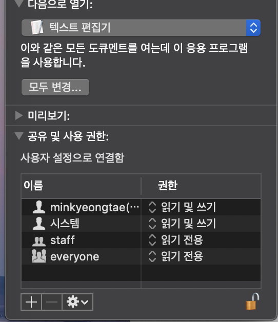 하단을 보면 "공유 및 사용 권한" 파트에 권한내용이 있는데요. 자물쇠를 눌러서 사용자계정 비밀번호를 입력해줍니다.