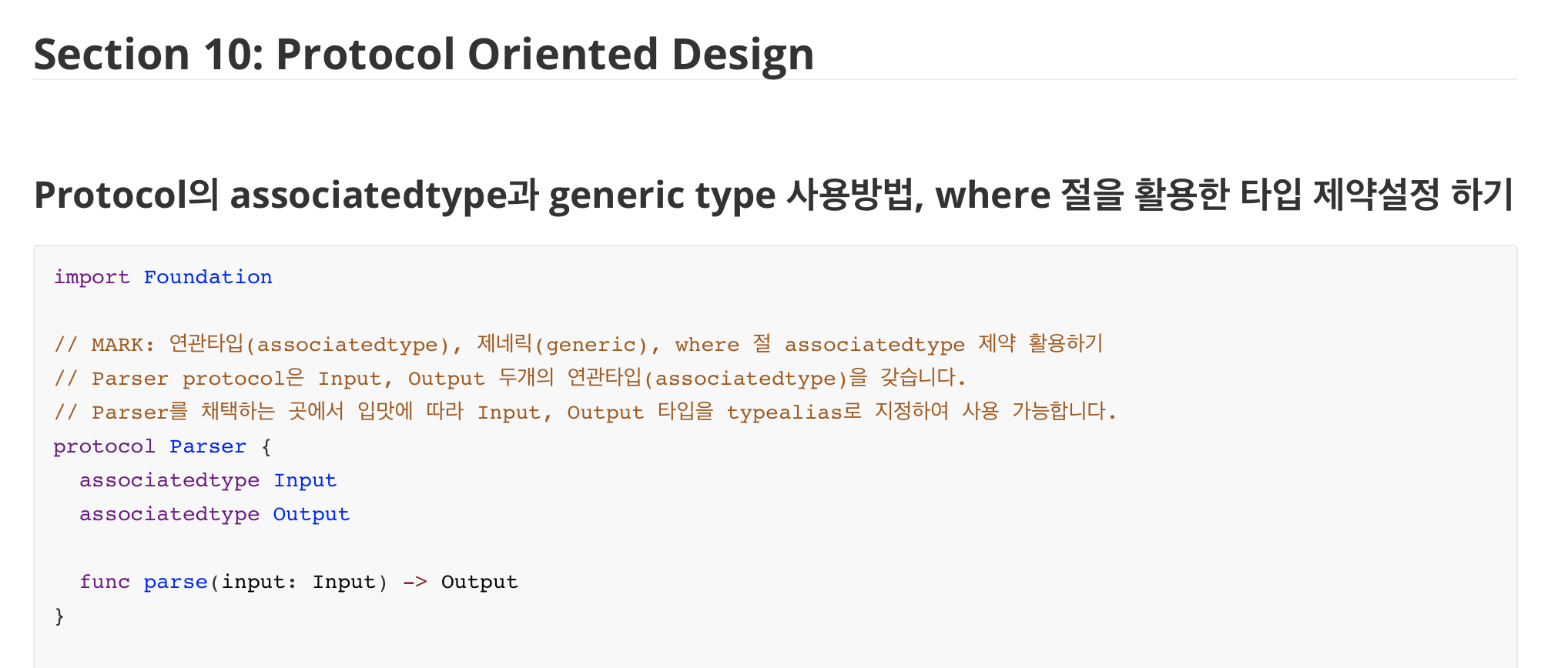 오늘은 Udemy강의에서 다뤘던 내용을 복습하는 차원에서 swift의 Protocol에 associatedtype을 지정하고 활용하는 방법과 associatedtype에 대한 제약을 주는 방법도 알아보겠습니다.
