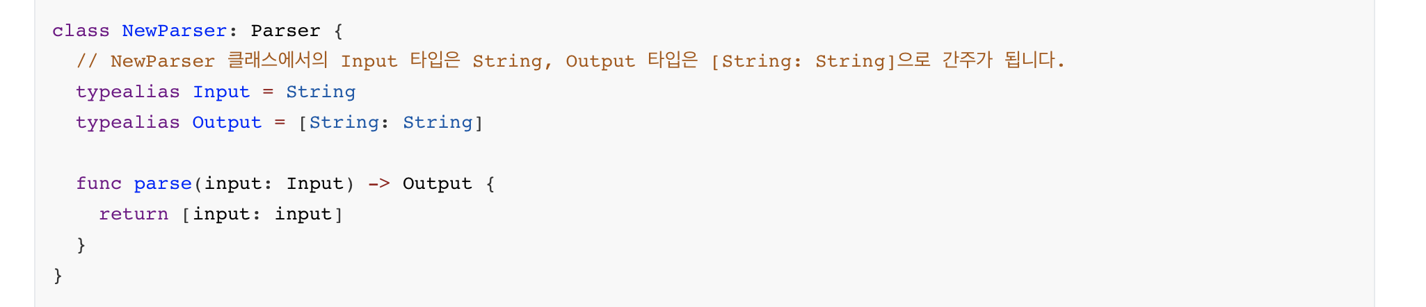 위와 같이 protocol 정의가 되는경우, NewParser 클래스에서의 Input 타입은 String, Ouput 타입은 [String: String]이 되는 것입니다.