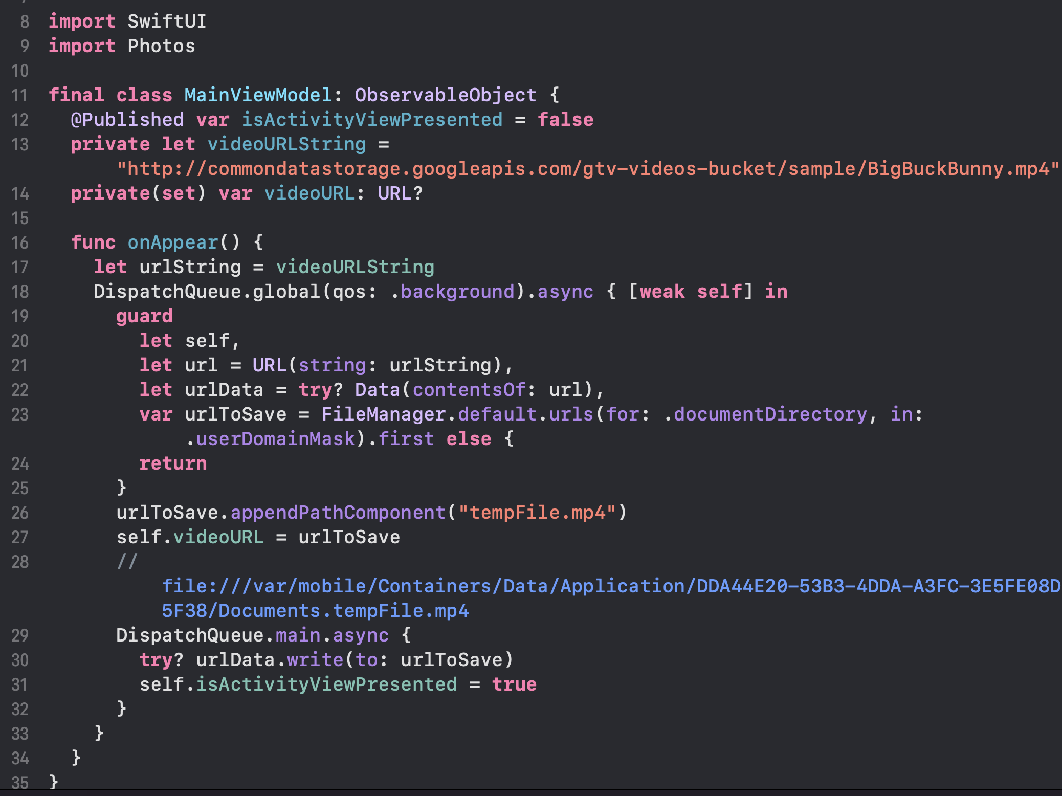 16행 ~ 25행) onAppear 이벤트가 발생할때 호출될 메서드로, 저장하려는 비디오 URL을 생성하고 데이터를 만들고, FilieManager를 통해 앱 로컬에 파일을 저장하는 작업이 수행됩니다.