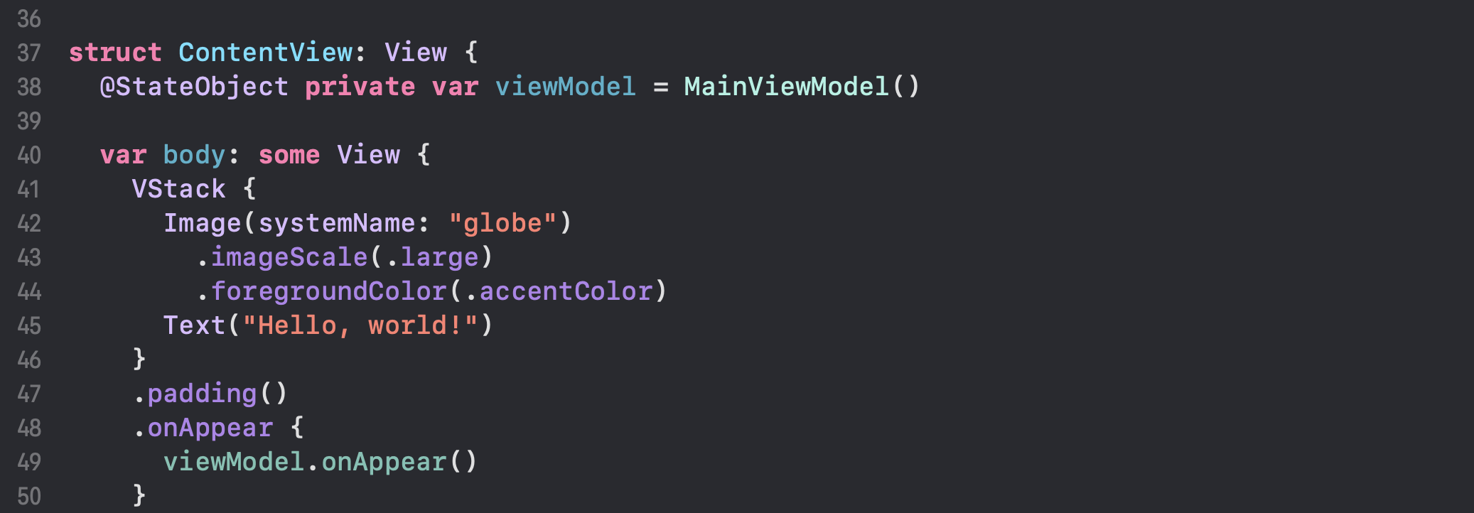 그 밑에 뷰는 특정 이미지, 텍스트가 나오도록 임의로 지정했구요. onAppear 블록 내에서 viewModel의 onAppear 이벤트를 호출하고 있습니다.