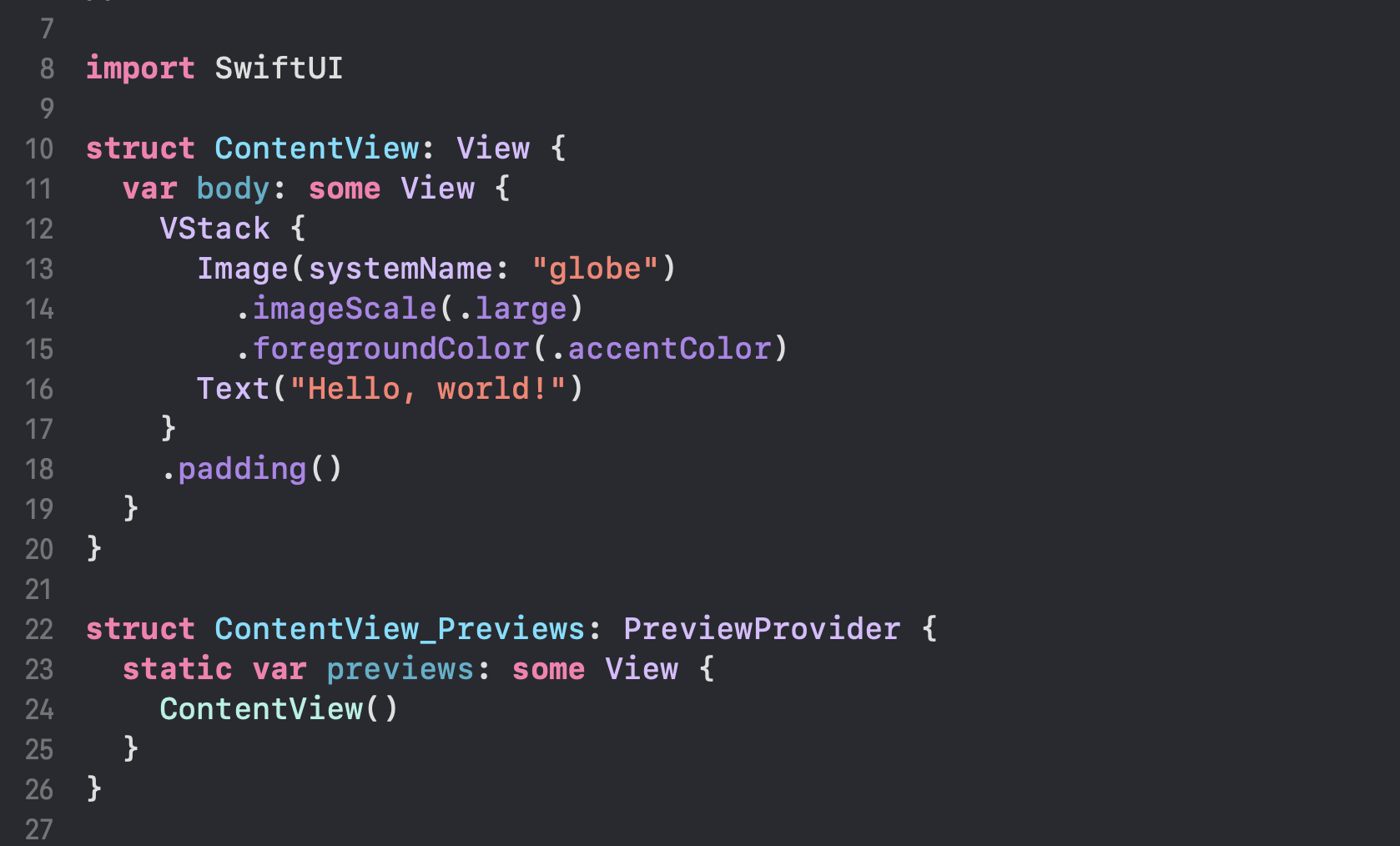 앞서 SceneDelegate.swift에서 UIHostingViewController의 rootView로 전달한 ContentView입니다. 기본 프로젝트 생성 시 작성되어있는 ContentView를 그대로 사용했습니다.