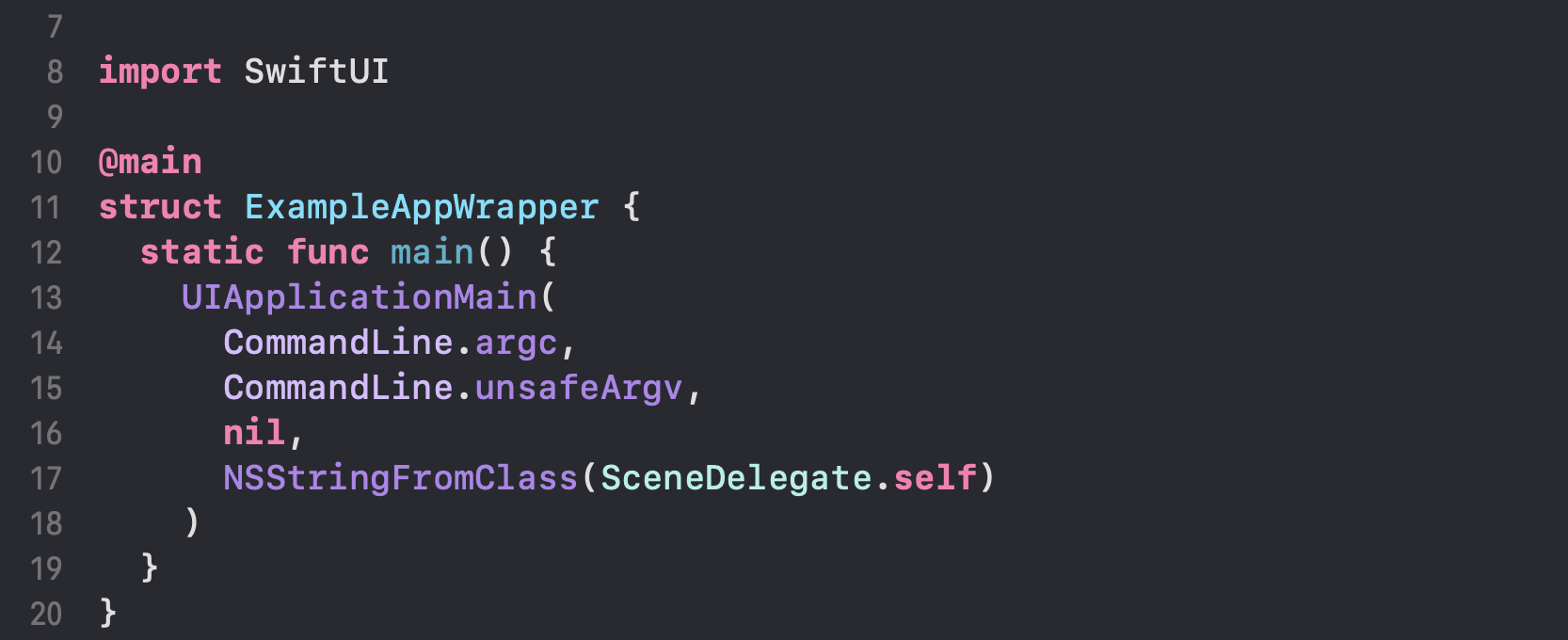 App을 위한 Wrapper 구조체를 생성해 줍니다. 여기에서 UIApplicationMain을 생성하고, UIApplicationMain 생성자 의 delegateClassName 인자로 앞서 생성한 SceneDelegate 코드와 연결을 시켜줍니다.
