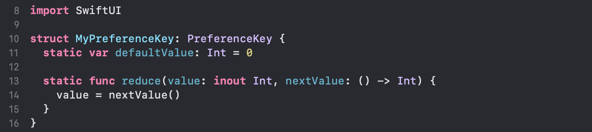이제 PreferenceKey를 사용해봅시다. MyPreferenceKey 구조체는 PreferenceKey를 채택하고 있습니다.