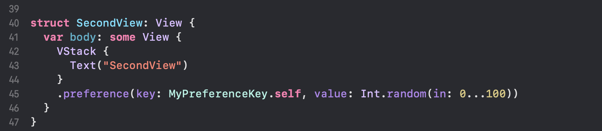SecondView입니다. SecondView가 보이면 preference viewModifier에 의해 0 ~ 100 사이 랜덤 값이 MyPreferenceKey의 value로 설정이 됩니다.