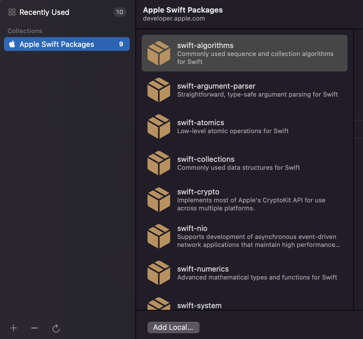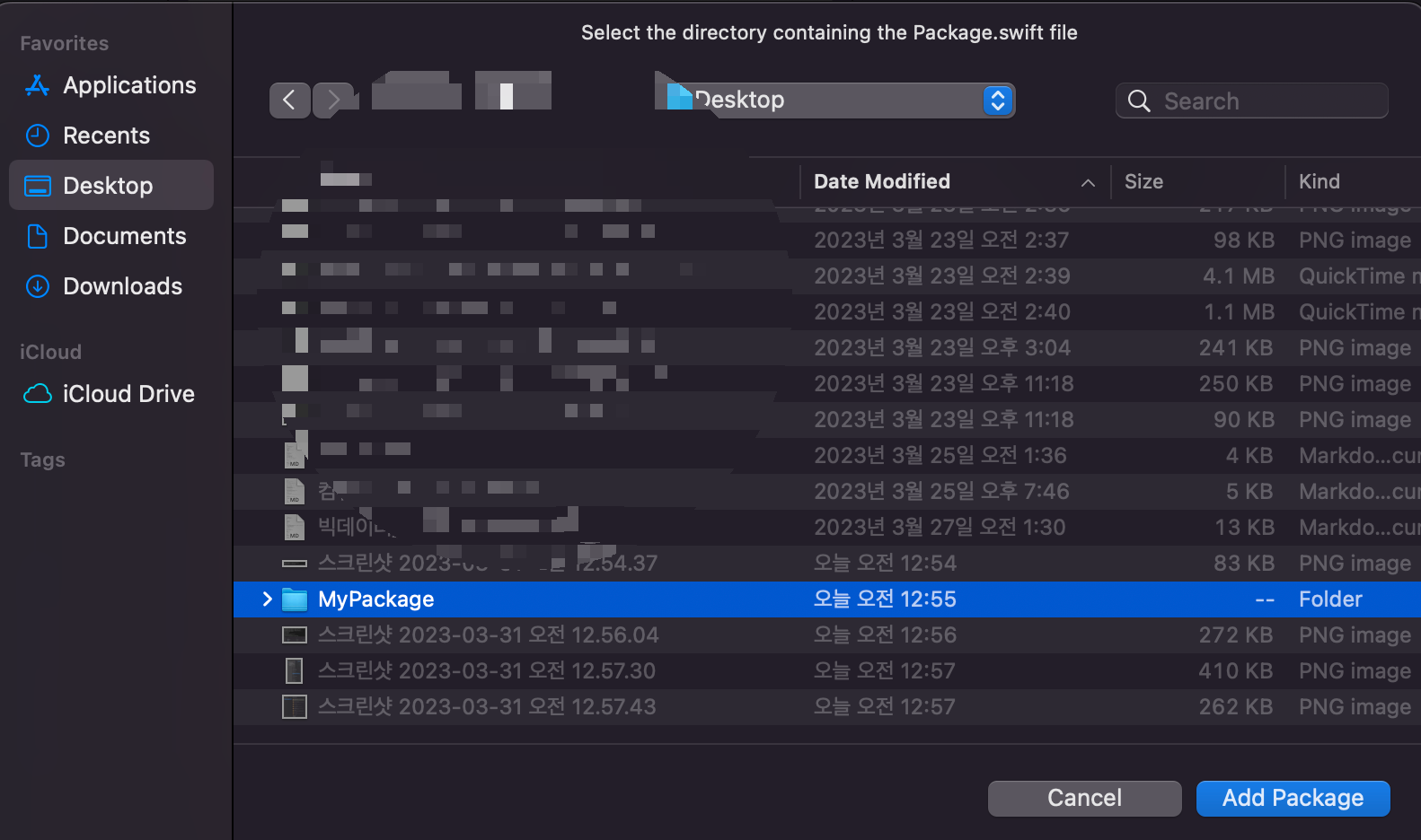 바탕화면에 만들었던 swift package가 들어있는 폴더를 선택 후, "Add Package"를 클릭합니다.