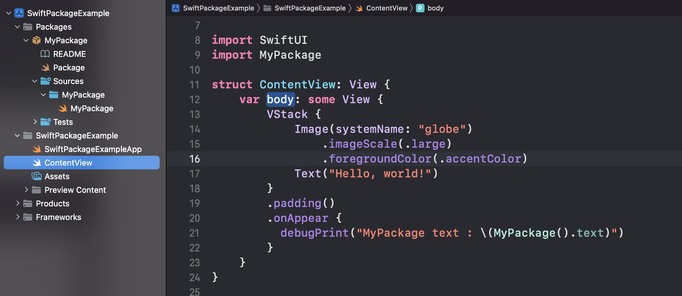 임의로 처음 표출되는 화면의 onAppear 이벤트에 MyPackage 관련 String 멤버를 출력해보겠습니다. "import MyPackage" 도 작성하여 MyPackage를 import 해줍니다.