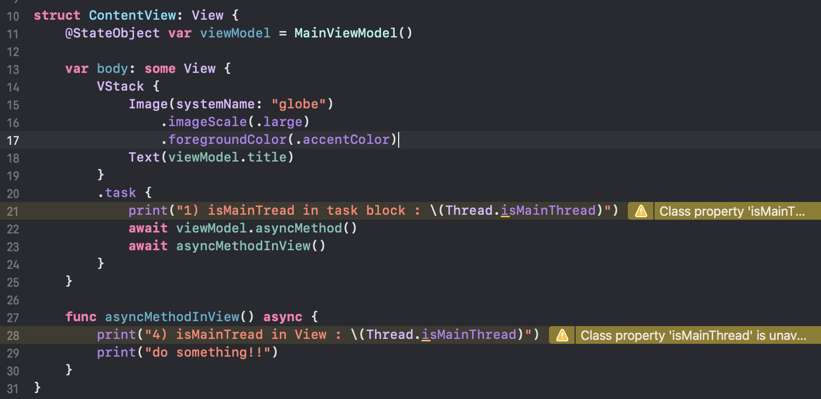일단 27행에 구현된 asyncMethodInView() async { ... } 는 MainActor 등이 명시되어있지 않은 일반 async await 메서드입니다. 이런 경우에는 DispatchQueue.main 블럭 내에서 사용되거나, MainActor 명시가 되어있지 않기 때문에 백그라운드 스레드에서 동작을 할 것으로 볼 수도 있는데요. 과연 그럴까요?